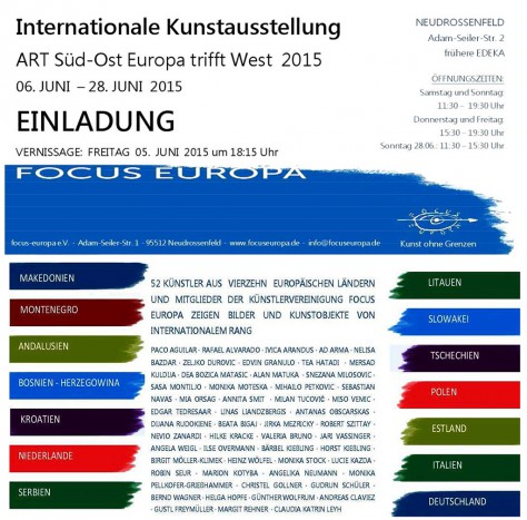 Jurierte Kunstausstellung mit focus-Künstlern aus: Deutschland, Italien, Polen, Slowakei, Litauen, Lettland, Estland, Tschechien und europäischen Gästen aus Süd-Ost Europa: Slowenien, Kroatien, Makedonien, Montenegro, Bosnien-Herzegowina, Serbien und West: Andalusien, Niederlande. (JG,K)