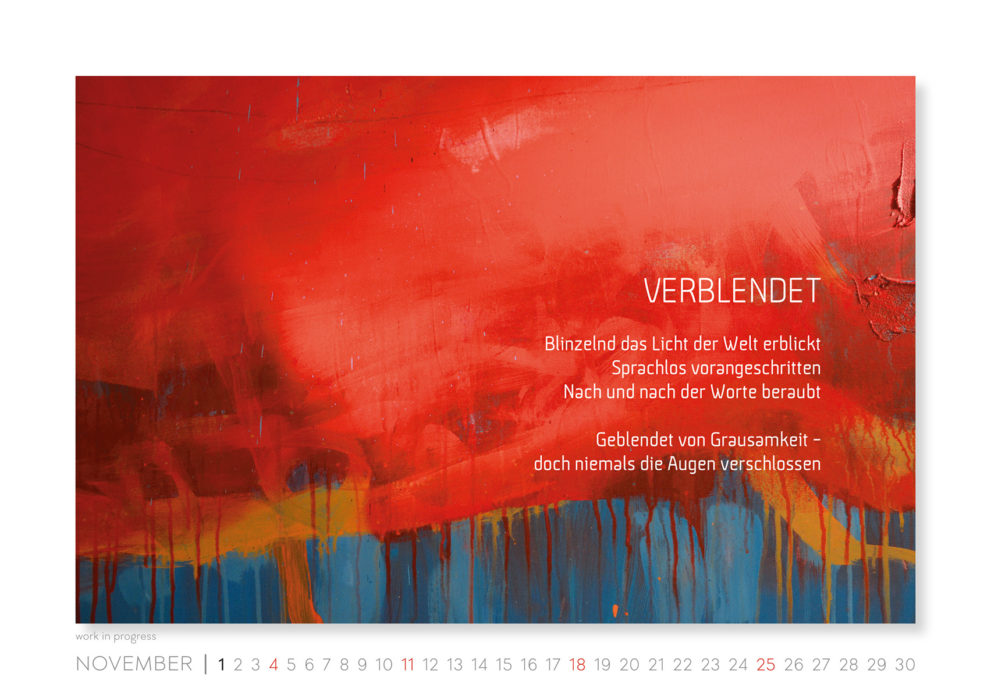 Bereits zum zehnten Mal erscheint nun mein Kalender mit aktuellen Kunstwerken und Texten, die extra für dafür entstanden sind.