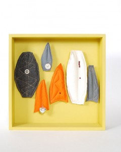 Schmetterlingsfilz_gelb2 Serie Schmetterlingsfilz | 2004 | Objekte im Holzkasten + Acryl auf LW | je 30 x 30 cm